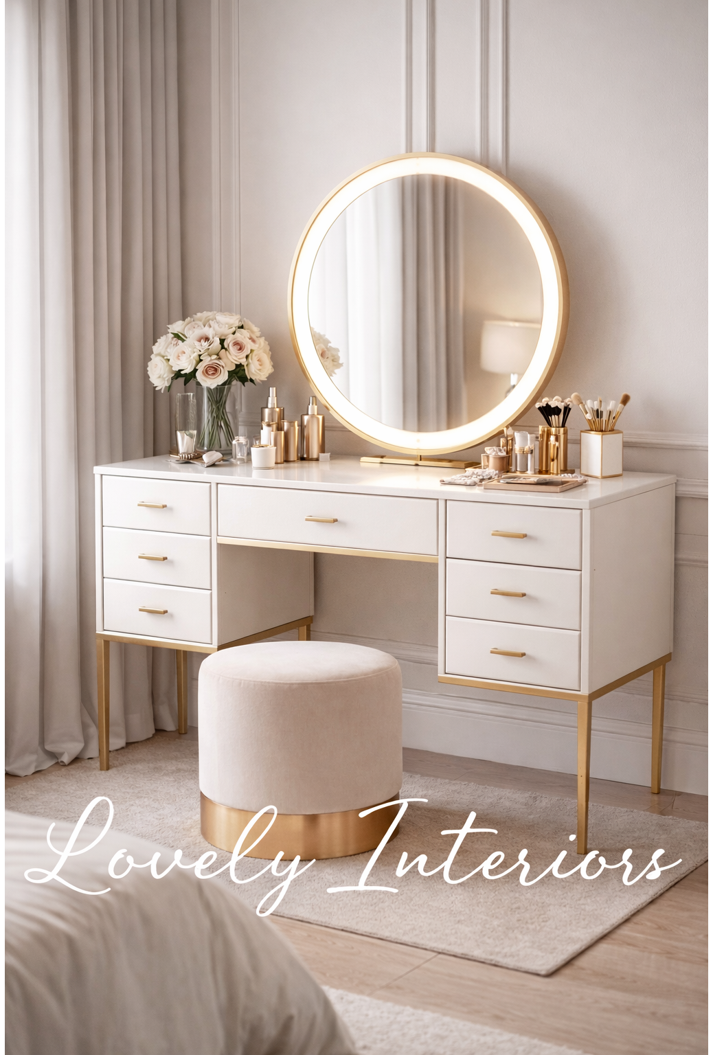 This luxurious dressing table by Lovely Interiors blends modern elegance with timeless charm. Crafted in a soothing white finish with premium gold accents, it features a spacious tabletop, multiple smooth-glide drawers for organized storage, and a beautifully illuminated round mirror that adds both style and functionality. The soft upholstered stool completes the look, offering comfort while enhancing the overall aesthetic. Perfect for contemporary bedrooms, this dressing table transforms daily routines into a refined experience, reflecting sophistication, practicality, and premium craftsmanship.
